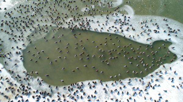 众多鸟儿在水中畅游嬉戏,一幅人与自然和谐共融的美丽画卷徐徐展开。新华网发(杨斌 摄)