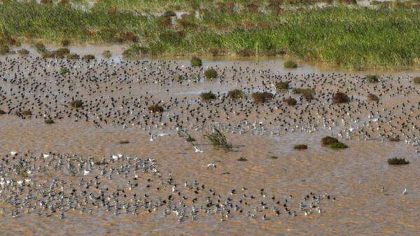鸟儿在浅滩上停驻、觅食。新华网发(杨斌 摄)