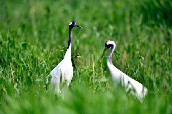 黄河三角洲自然保护区的两只丹顶鹤在水草间栖息。新华社记者郭绪雷摄