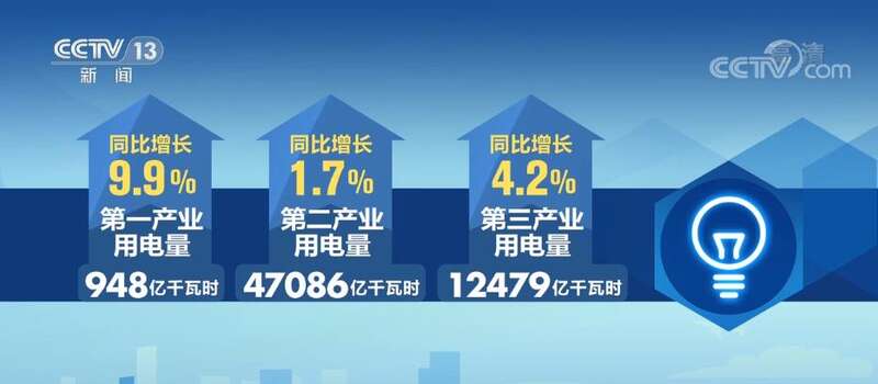 分产业看,第一产业用电量948亿千瓦时,同比增长9.9%;第二产业用电量47086亿千瓦时,同比增长1.7%;第三产业用电量12479亿千瓦时,同比增长4.2%;城乡居民生活用电量11247亿千瓦时,同比增长12.6%。