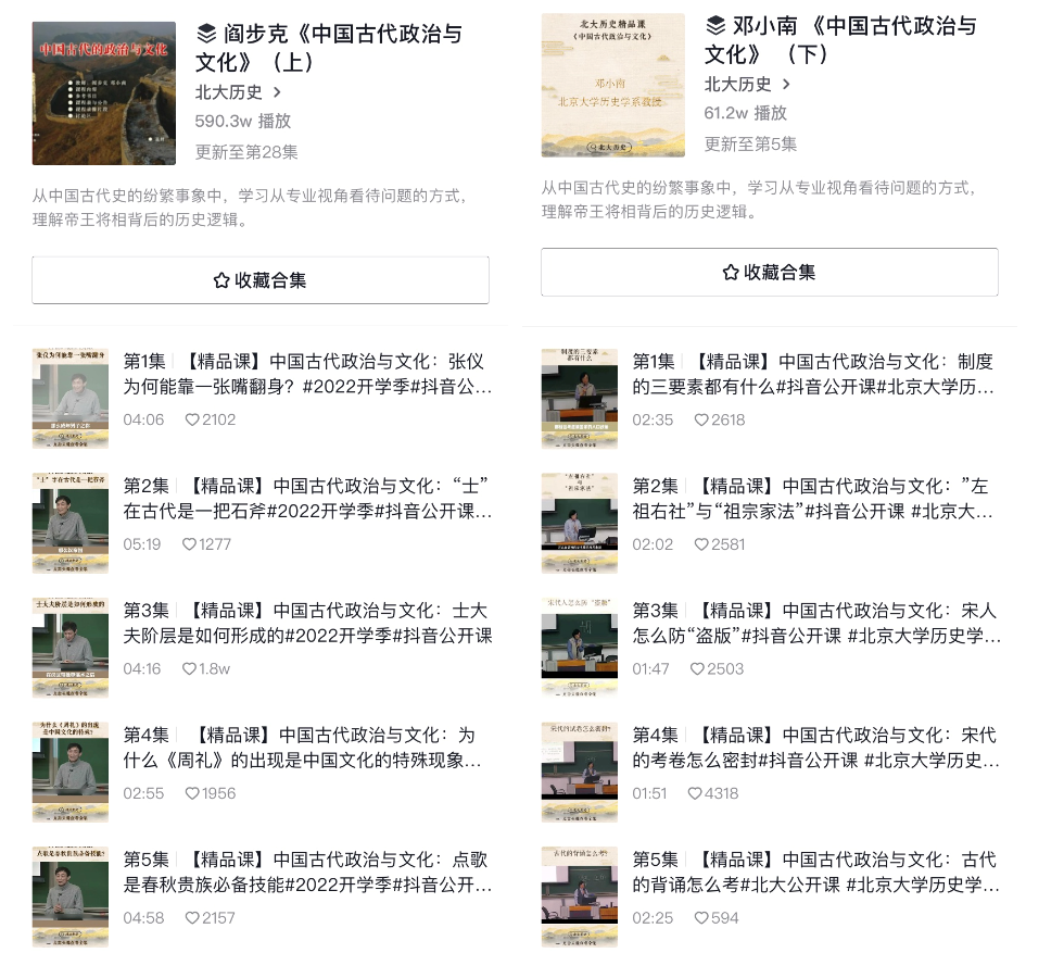 北京大学历史学系在正式入驻抖音平台后,上线了第一套课程——《中国古代政治与文化》。这门国家级精品课程历经十余年的锤炼,由北京大学历史学系教授邓小南、阎步克主讲,既是北京大学的核心通识课程,也是北大学生最喜爱的通选课之一。