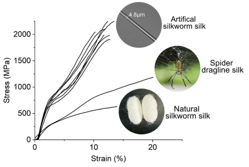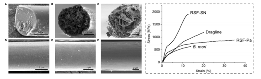 天然蜘蛛丝具有优异的机械性能,是自然界已知韧性最强的天然纤维,在力学强度上,蛛丝可与强度最高的碳纤维及高强合成纤维(如Kevlar纤维)等相媲美,而同时具有十分明显的韧性优势。据悉,一根铅笔芯粗的蛛丝足以支撑一艘万吨级的船,其无与伦比的高强度、高韧性使得蜘蛛丝纤维在国防、军事、建筑等领域具有广阔应用前景。