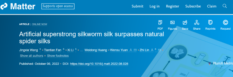 总结一下,这篇工作开发了一种简便的化学浴联合金属离子浴的方法,有史以来第一次将廉价的普通蚕丝转换成性能超越超过天然蜘蛛丝的具有超高强韧性的人工蚕丝。这项研究所开发的方法将为大规模生产具有高性能、高利润的蚕丝纺织品材料提供坚实的技术基础!