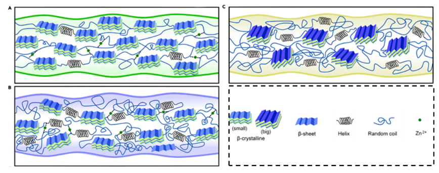 人工纺丝的具体过程如下:研究人员将浓缩的RSF-SN或RSF-Pa通过微管像挤牙膏一样挤出,并将挤出的材料迅速浸泡在含有锌离子和铁离子的溶液中,从而形成细长的纤维。由此得到的RSF-SN纤维展现出了极高的抗拉伸强度(2054±177 MPa),比脱胶的天然蚕丝(610±84 MPa)和蛛丝(1117±275 MPa)高出200 %和70 %以上,并且其平均杨氏模量为43±6 GPa,显著高于所以已知的天然微丝(<20 GPa)。人工再纺蚕丝具备优异强韧性可能主要得益于以下几个方面:(i)β-折叠的含量在50%以上,接近于天然蛛丝;(ii)具有高结晶度,内部含有类似天然蛛丝内的纳米微晶;(iii)Zn2+结合氨基酸残基起到类似交联的作用。