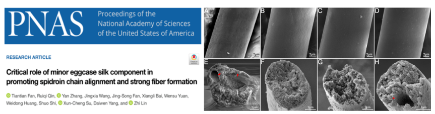 其实,早在2021年的时候,林志教授团队就通过核磁共振(NMR)并结合材料学技术,对蛛丝的成分和机理进行了相关探索,在PNAS上发文的研究论文揭示蜘蛛卵鞘丝次要成份蛋白TuSp2的结构与成丝机理,研究发现其内部的次要成份TuSp2蛋白不仅能加速主成分TuSp1蛋白的自组装,还能在机械剪切力作用下促进纤维内部的丝蛋白进行有序排列。并进一步基于结构机理设计了含有TuSp1和TuSp2的微型丝蛋白,通过探究发现,由主要与次要成份蛋白共同制出的人工微丝强度比原本的天然蜘蛛卵鞘丝要更佳,这一研究为进一步设计具有高机械性能的丝蛋白材料提供了新的方向,同时也为此次研发出超强人工蚕丝奠定了概念及思路基础。