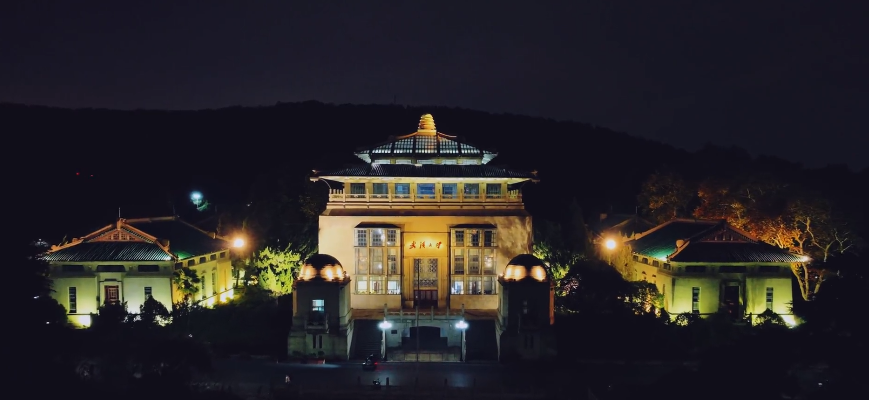 ▲行政楼和樱顶老图书馆的灯为窦贤康校长点亮