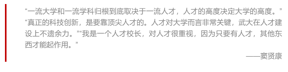 “人才,特别是高端人才、战略人才、领军人才,是决定学校发展的‘关键少数’,是学校的核心竞争力。”2020年,《光明日报》撰文指出,“武汉大学把人才工作放在学校发展的首要位置,大力实施人才强校战略,充分释放‘人才第一资源’活力,走出了一条具有武大特色的人才强校之路”。