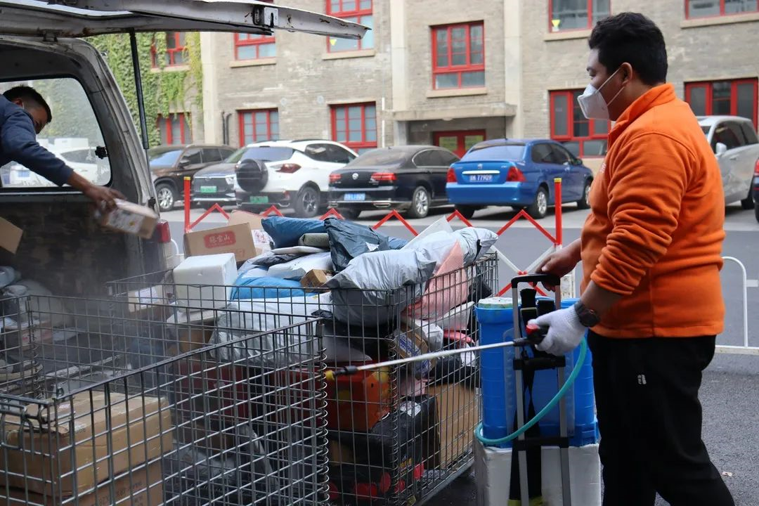 疫情以来,消杀成为近邻宝必不可少的工作程序,侯庆岩师傅用一丝不苟的态度,守着快递到校的第一站。每当快递车满载包裹而来,他都会第一时间跑上前去,把货物从狭窄逼仄的车厢运到地上,再将它们平铺进行六面消毒,静置20—30分钟后这些包裹才能被投递。此外,侯师傅每天还需要对快递柜、前台、货架等进行至少三次环境消杀。这一过程繁琐而劳累,他往往会出一身的汗,胳膊也常有酸痛感,但侯师傅从未有过怨言,始终坚持勤恳工作,为师生们送去最安全的快递。