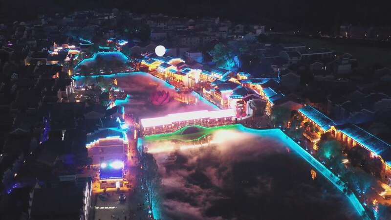 长街深巷依旧在,身着古代服饰的演员们舞姿婀娜,大型沉浸式实景演出《流芳》每天都在上演。演出结合跑酷、悬浮装置、水雾造景等,不仅还原村史馆、地方志等记载的真实历史故事,还将霉鱼、霉豆腐等传统小吃的叫卖场景融入其中。
