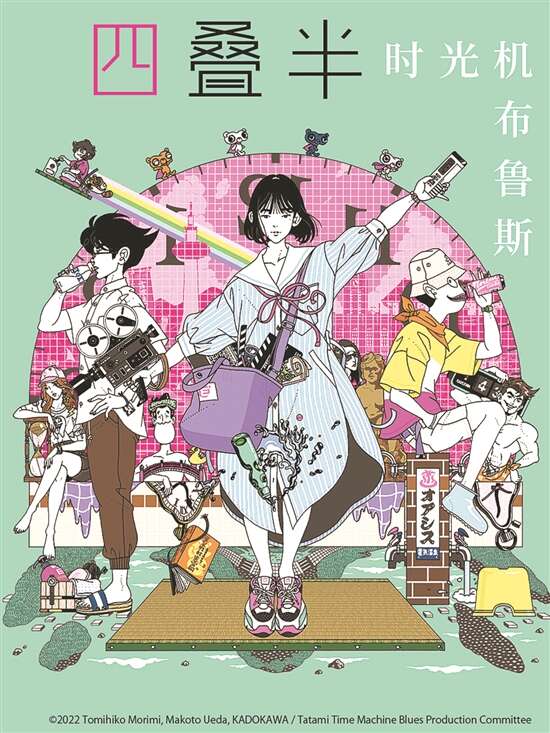 我把《四叠半时光机》视为《四叠半神话大系》里的一个平行宇宙。在这里,主人公“我”和损友小津、师匠、羽贯小姐、城崎前辈以及黑发少女明石等人展开了一趟拯救空调遥控器的“时光机大冒险”。这部作品将森见作品中的宅男气息和“四叠半主义”贯彻到底:主人公“我”仍是一个想得太多、行动太少的废柴大学生,絮絮叨叨有着大起大落的内心戏贯穿整部动画;而“我”与朋友们的时光穿梭之旅虽然在时间上跨度极大,但空间上始终离不开老旧宿舍楼“下鸭幽水庄”。时隔多年能够再次看到这些熟悉的元素(《四叠半神话大系》已经是12年前的动画作品了),作为森见爱好者的我已经十分满足。另外,由于这部作品的监督夏目真悟也是《四叠半神话大系》的分集导演之一,因此《四叠半时光机》同样采用了大量的拼贴、大色块、色彩冲突、真实影像转换等风格,能够轻易让观众找到当年看《四叠半神话大系》的亲切感。