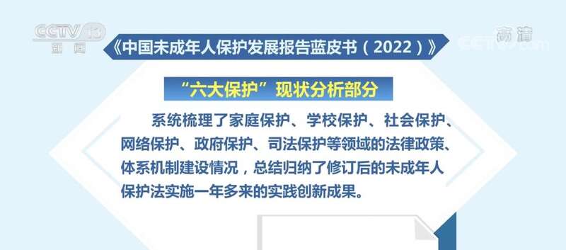 《中国未成年人保护发展报告蓝皮书(2022)》共计43万字,分为总报告、“六大保护”现状分析和专题报告三个部分。其中,“六大保护”现状分析部分系统梳理了家庭保护、学校保护、社会保护、网络保护、政府保护、司法保护等领域的法律政策、体系机制建设情况,总结归纳了修订后的未成年人保护法实施一年多来的实践创新成果。