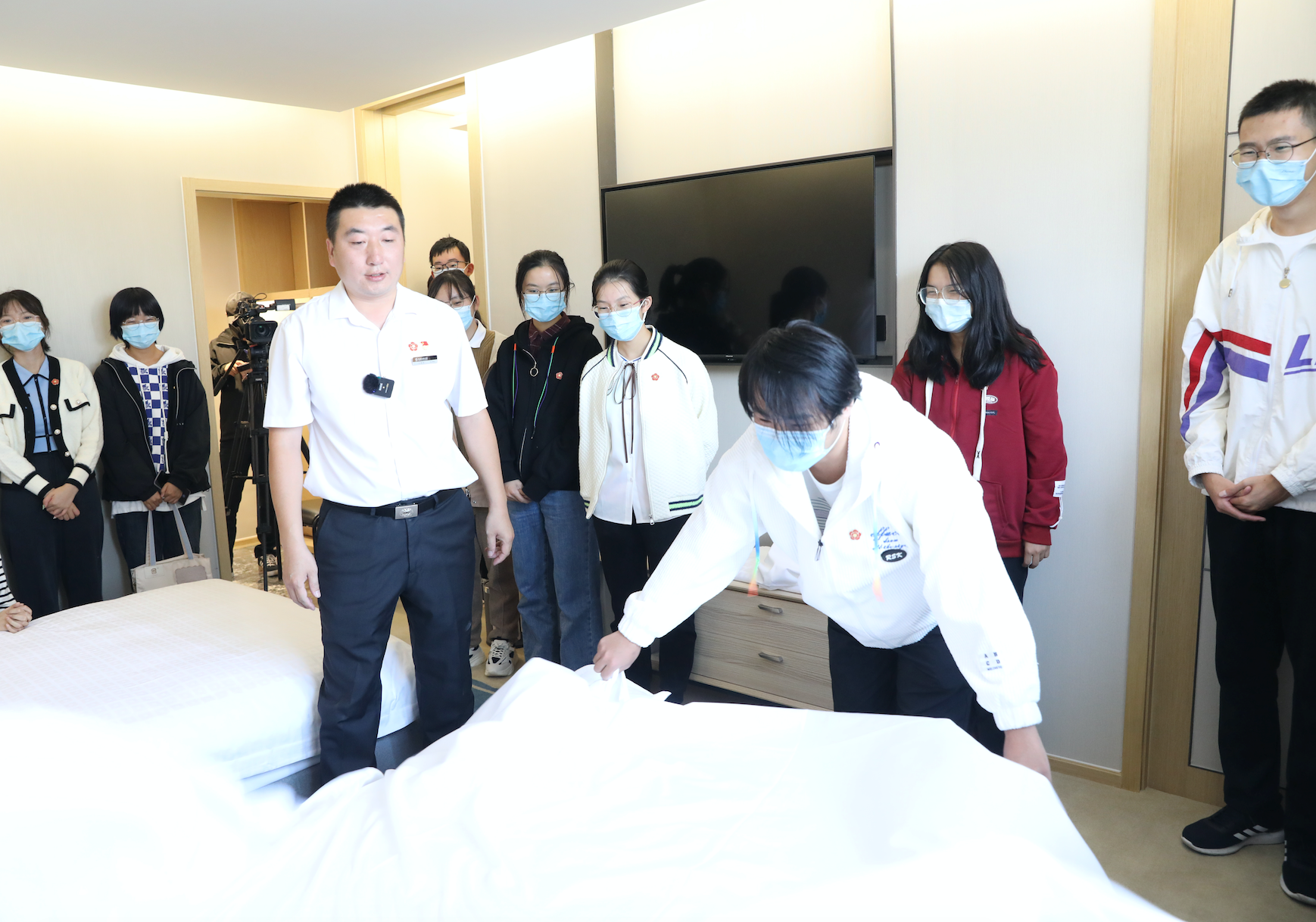 在北京大学勺园9号楼的客房里,同学们在张兴惠的带领下,亲手体验如何又快又好地铺好床单。“甩床单”这件事,是张兴惠来到勺园客房部后学会的第一项技能。“我有很强的臂力,甩床单时会发出清脆的响声,床单落下基本成型。”张兴惠一边指导同学,一边笑着回忆道。