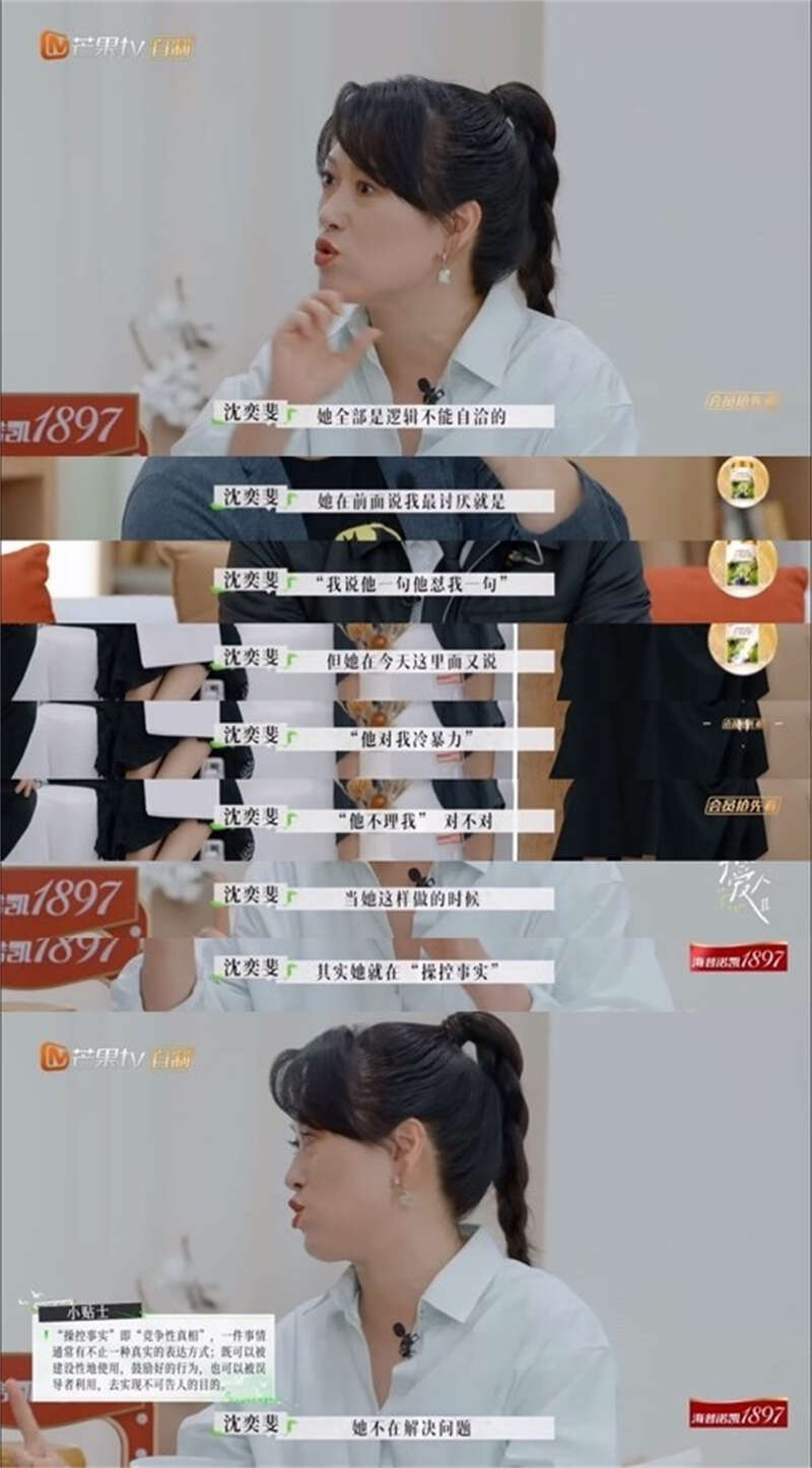 从这里开始,这一对引发了巨大的讨论,对他们的讨论已经脱离了婚姻范畴,张婉婷成为全民对一类人性格或人格的讨论中心,观察室的嘉宾首先提出了这个感受,胡彦斌说:“她的目的是让她老公有亏欠感,然后愿意听她的,让现场所有人,帮她一起精神控制。”沈奕斐则从理论角度提出,张婉婷前后控诉问题不一致是在操控事实。