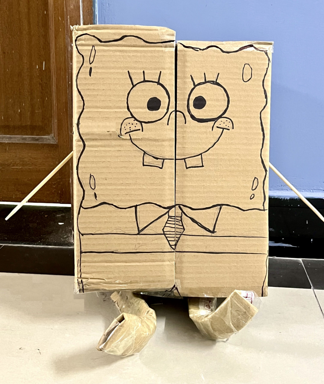 属于我们宿舍的海绵宝宝的“出生”可是有一定困难的。第一个难关就是把大量的包装盒拆开重组,要是没有点耐心,在这一步海绵宝宝可能就说再见啦。制作过程里最大的“拦路虎”是它的腿,透明胶和筷子大法相继宣告失败,最后我们决定让它舒坦地坐在地上。我们宿舍都很喜欢这位新朋友~它是我们一起奋斗的见证,是我们默契的象征!