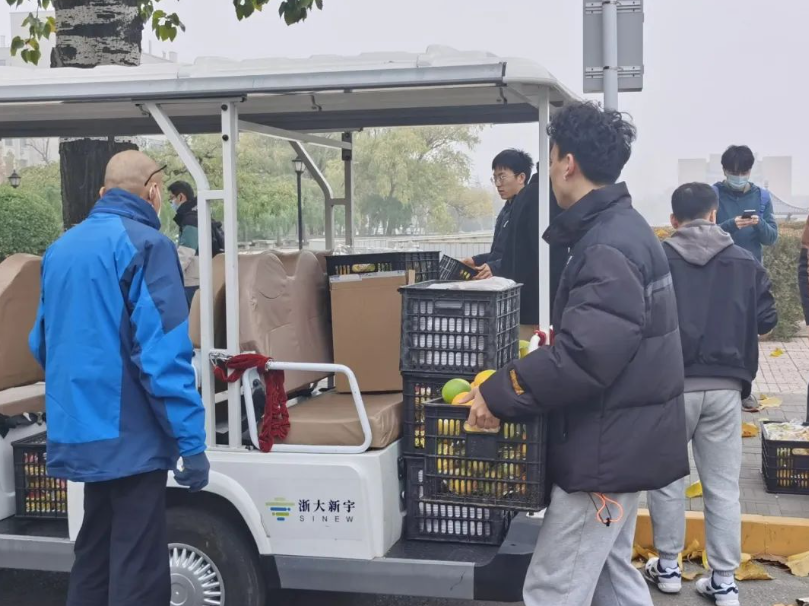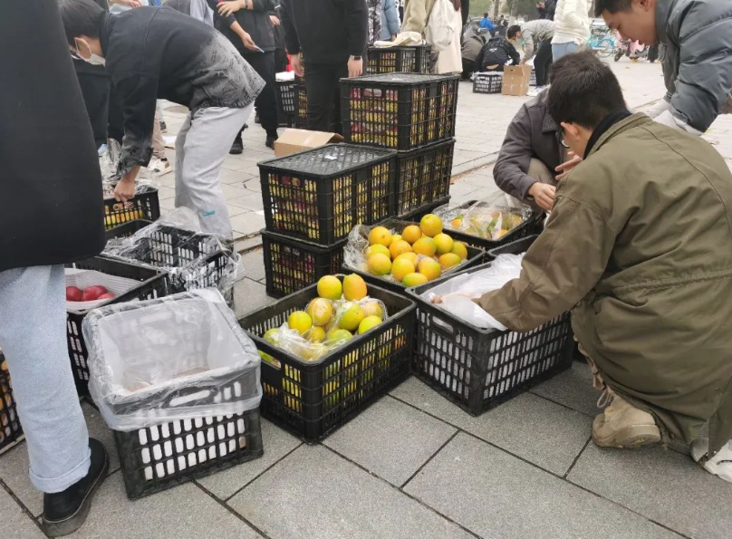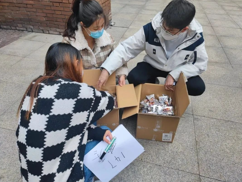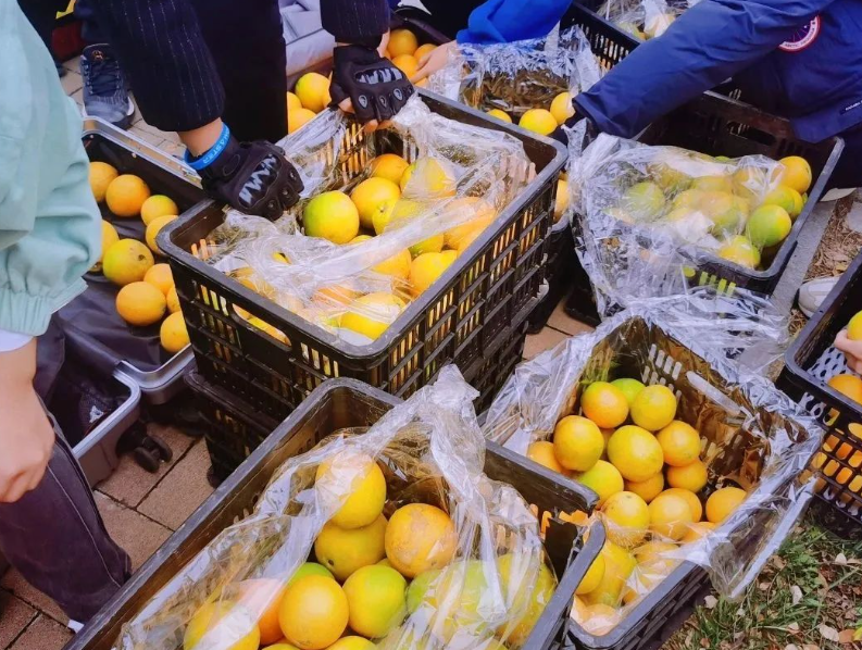 在甜蜜的背后,也离不开志愿者们的辛勤付出。寒风凛凛,晨曦刚至,水果工程委员会的志愿者已培训完毕,去到各个点位清点数量,细心地布置好了发放场地。箱箱红心火龙果甜香诱人、鲜红饱满,脐橙圆圆润润、黄澄可爱,散发的果香弥漫在各个角落,静静地等待着各学院同学们的到来。他们的脸被吹得通红,手指被冻得僵硬,但他们的脸上洋溢着喜悦的笑容,因为他们的努力让同学们在这个冬天也能倍感甜蜜,吃到香甜多汁的水果。