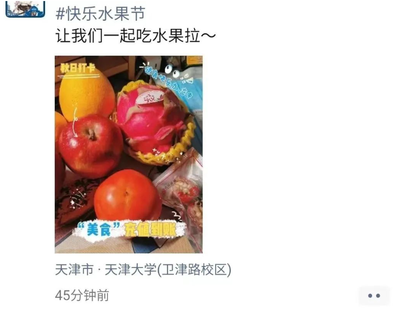 天津大学水果工程自2002年正式启动,在每年春、秋两季为天大学子免费发放水果,并开展一系列趣味活动,至今已走过21个年头。