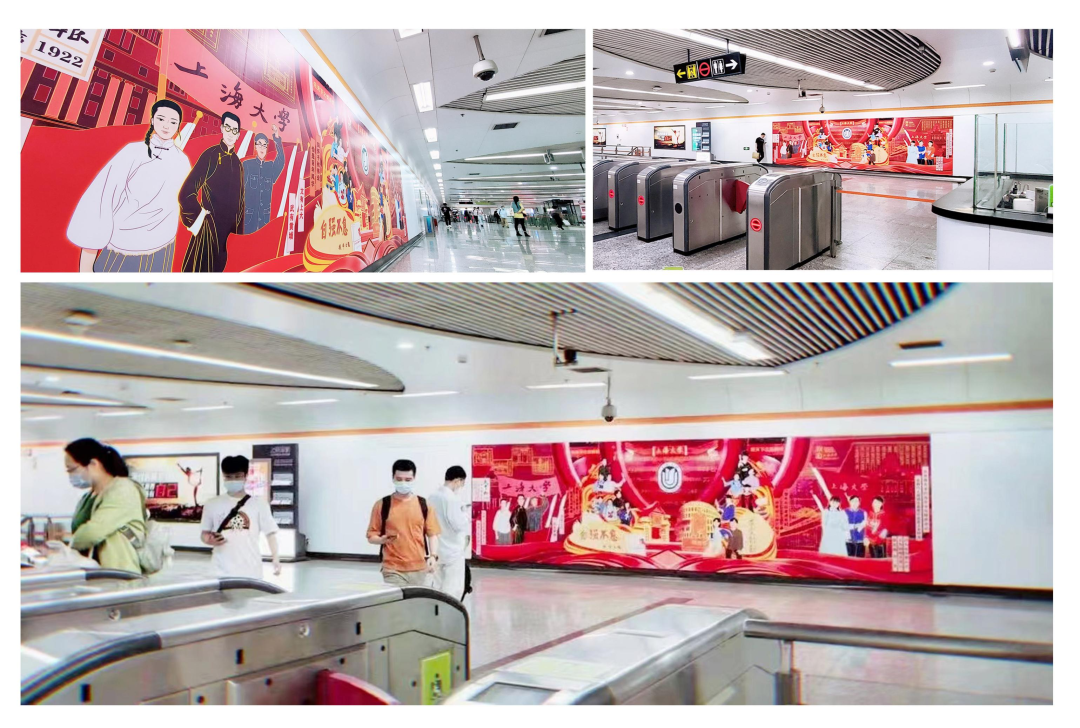 上海地铁7号线“上海大学”站出站口,展示着一副《红色学府》的壁画,生动描绘了这所红色学府的百年峥嵘岁月,也打开了许许多多新同学上大生活的扉页。