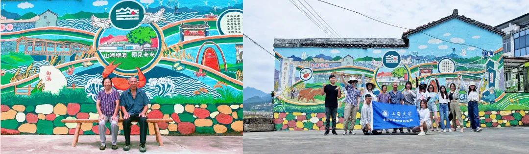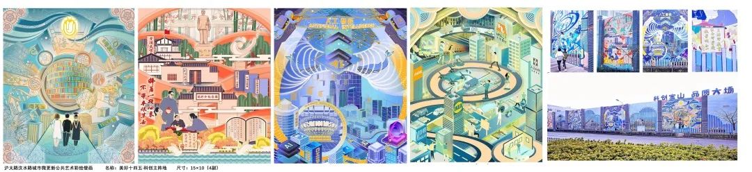 此外,王斌还参与了钱伟长图书馆进门处、锦秋路墙绘等的设计,其中锦秋路墙绘分为两个主题,“环上大”与“红色学府”。跟随着美院的金江波副院长与张承龙老师,王斌围绕着大场镇“十四五规划”,从“行知在大场”“环上大科技园”“智慧社区与智慧城市”以及“美好生活”四个主题进行展开。目前仍有项目在推进之中,如“环上大空间艺术季”等。