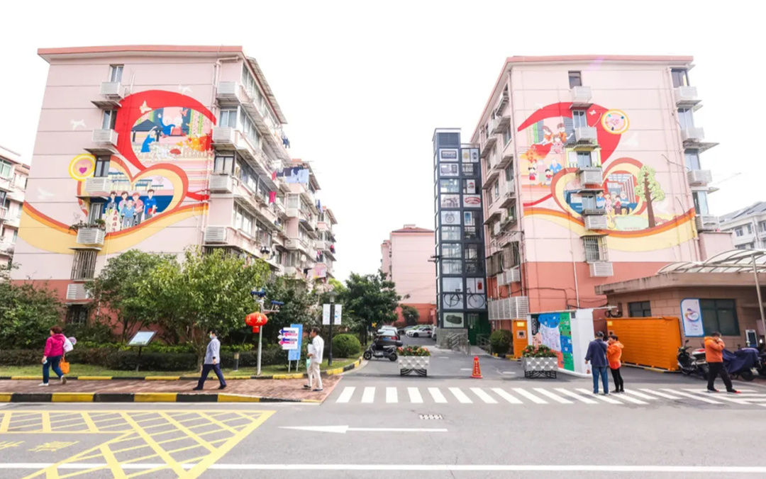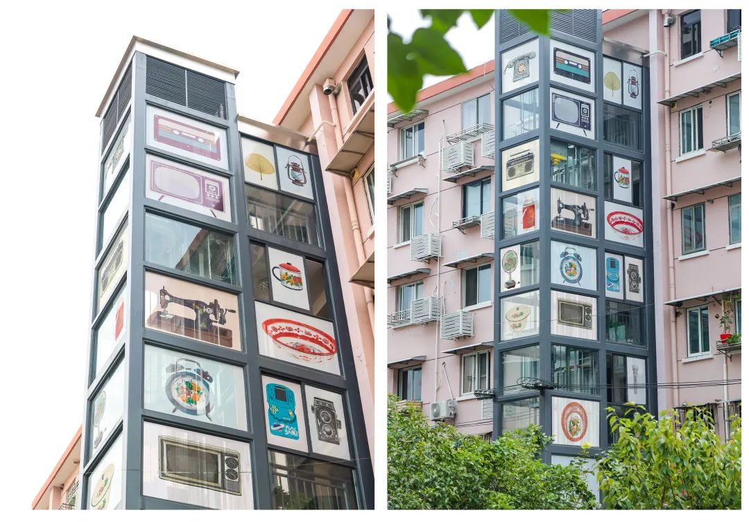 作品包括外墙上三颗爱心连成的彩绘图案,还有电梯外围的“年代置物架”等。“年代置物架”是一项别出心裁的设计,王斌用老人们熟悉和喜爱的“老物件”,以电梯板材隔间为框架,将老物件“摆置”在超高置物架上。从街道的视角看,《美好临汾》有着心连心的美好寓意,既揉合了年轻人视角下独特的年代情怀与回甘,又体现出来自社会的温暖和关爱。
