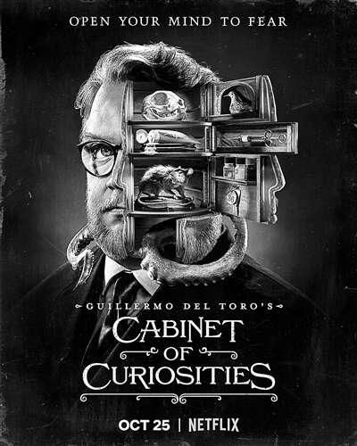 上个月末,恐怖类型短片合集《吉尔莫·德尔·托罗的奇思妙想》(以下简称《奇思妙想》)登陆流媒体平台网飞(Netflix)。好莱坞“墨西哥三杰”之一、导演吉尔莫·德尔·托罗不仅是整个剧集的制片、一头一尾两集的编剧,还在每一集片头打开自己收藏的珍奇柜(Cabinet of Curiosities),取出各集导演的小雕像和一个象征性的小物件,简要介绍每集的创作者和内容。从媒体采访中得知,托罗亲手遴选了短篇故事和八名导演,并希望给予他们最大限度的改编自由和终剪权。从最终结果看,《奇思妙想》的确很直接地反映了托罗个人的类型喜好和审美趣味,而他的趣味也免不了在一定程度上限制了导演们施展拳脚的空间。