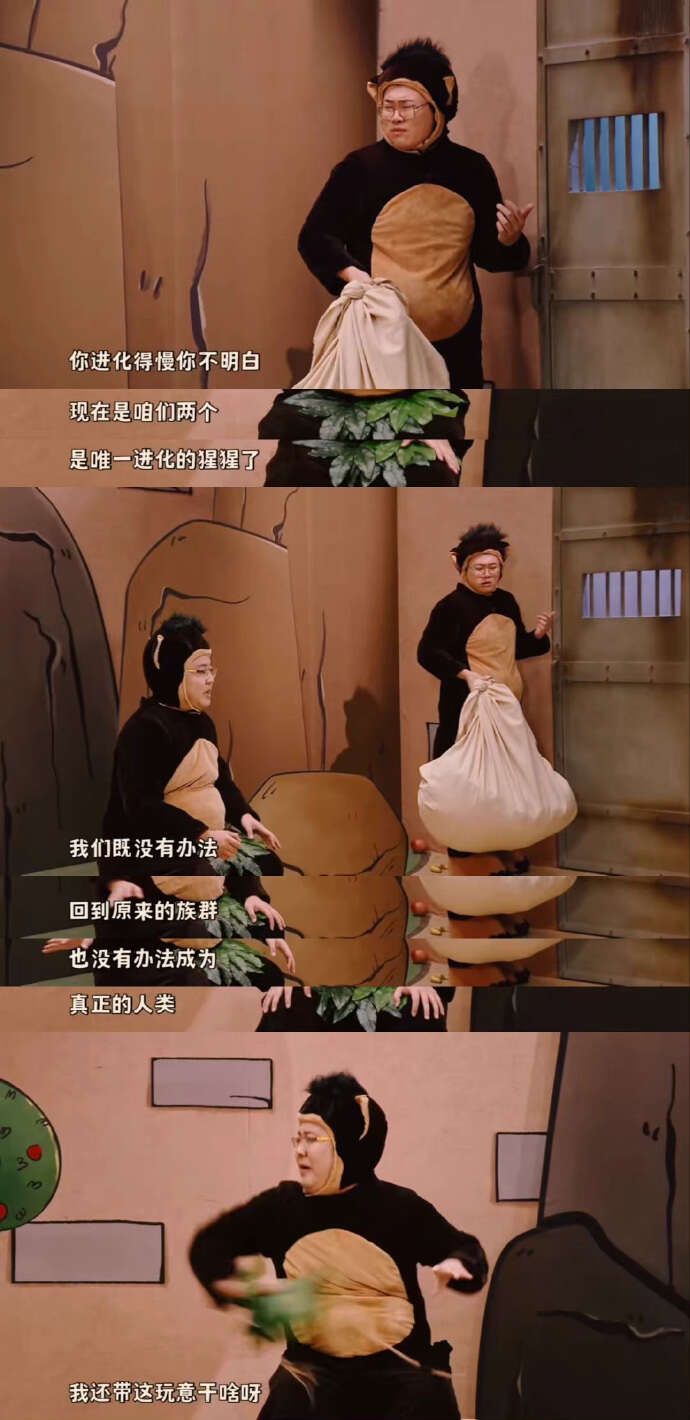 第一次出场的《大巴车上的奇怪邻座》上来就是不讲道理的漫才题材,没有逻辑没有故事,但就是能让人一顿爆笑。《父亲的葬礼》是许多观众在第一季节目里最喜欢的作品,荒诞中透着哲理,好笑里包着亲情,几乎是堪称完美的一个舞台。今年的第一个作品《代号大本钟》,跳出了荒诞漫才式的舒适圈,兼顾故事性和逻辑,不仅仅是很好笑。接着表演的《进化论》,创意性、荒诞感和讽刺性更上一层楼。