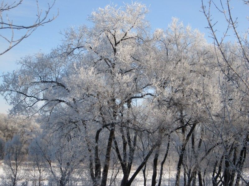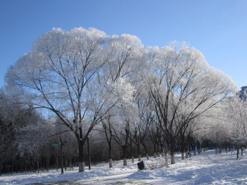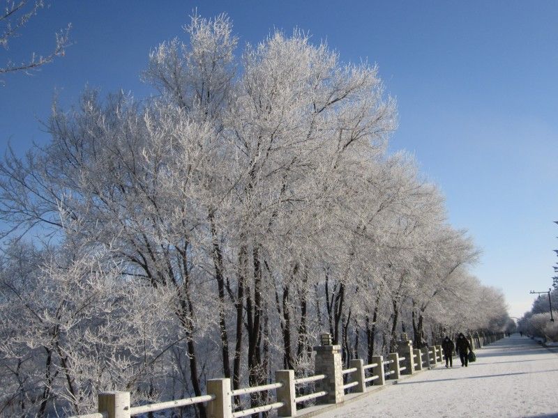 2022年11月23日,黑龙江黑河,江边现雾凇美景。满树银枝的雾凇奇观令人惊艳,不少黑河人都收到了这份初冬清晨给予的惊喜。