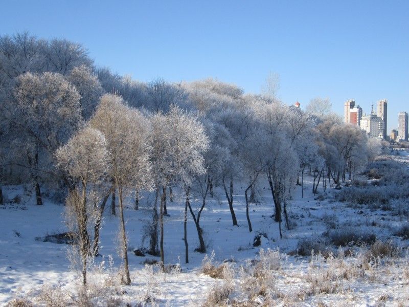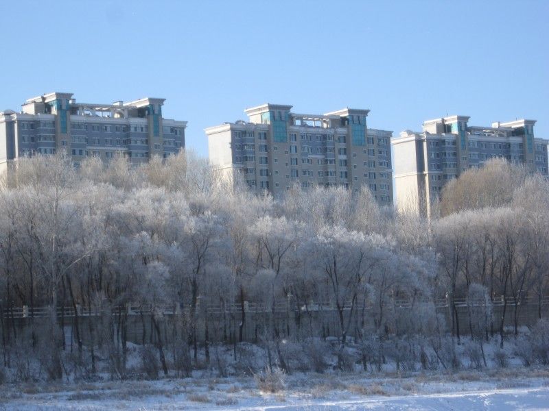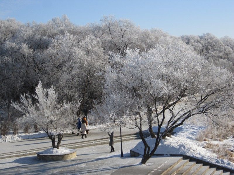 当日清晨,黑龙江黑河江段气温骤降到零下13度,进入流冰期的黑龙江两岸出现绵延数公里罕见雾凇景观,琼树银花、清秀雅致。