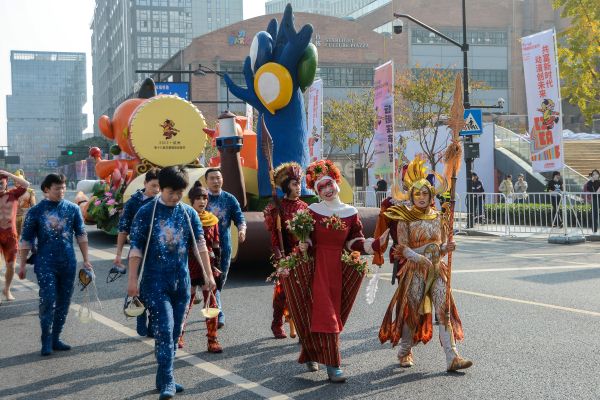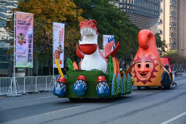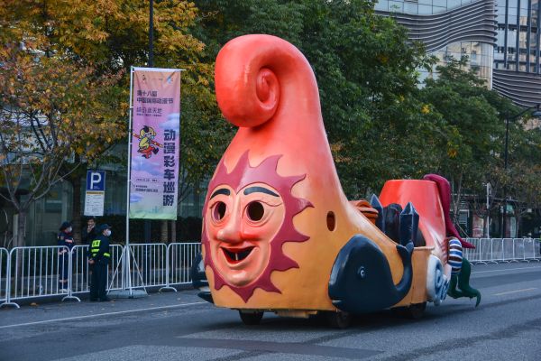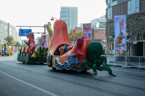 2022年11月26日,杭州,第十八届中国国际动漫节“彩车巡游”活动开启。阔别两年,彩车巡游回归,本次彩车巡游将围绕城市和动漫文化、动漫文化和大众生活结合度展开创意策划和展示,为杭州市民和动漫粉丝们呈现亮点鲜明、形式多样、动感十足的动漫大餐。