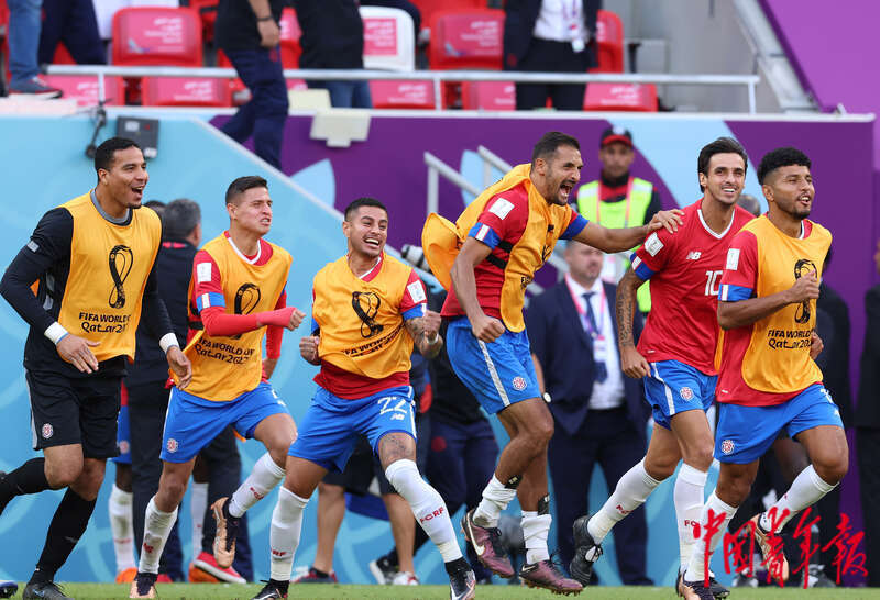 11月27日,在卡塔尔赖扬艾哈迈德·本·阿里体育场进行的2022卡塔尔世界杯足球赛E组比赛结束后,哥斯达黎加队队员庆祝获得比赛胜利。刘占崑/摄