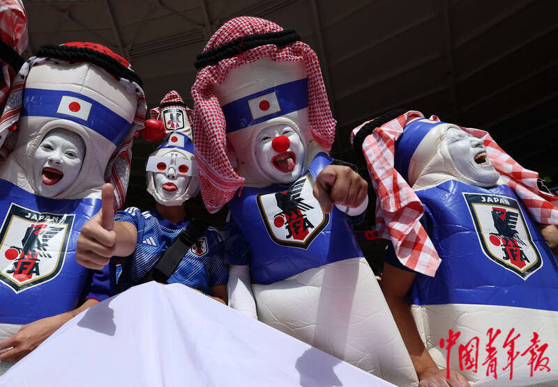 11月27日,在卡塔尔赖扬艾哈迈德·本·阿里体育场进行的2022卡塔尔世界杯足球赛E组比赛开始前,日本球迷秀奇装异服。刘占崑/摄