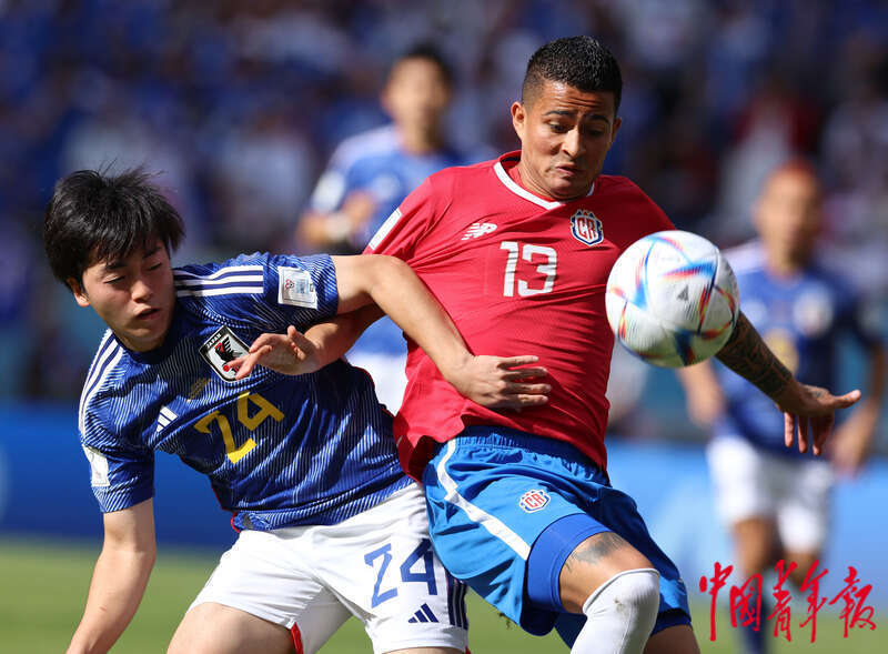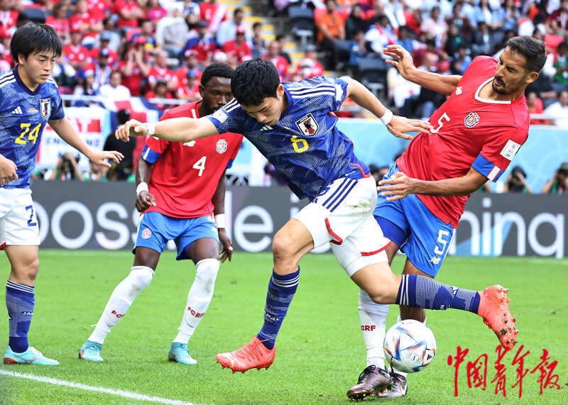 11月27日,在卡塔尔赖扬艾哈迈德·本·阿里体育场进行的2022卡塔尔世界杯足球赛E组比赛中,日本队与哥斯达黎加队双方卡位争抢。刘占崑/摄