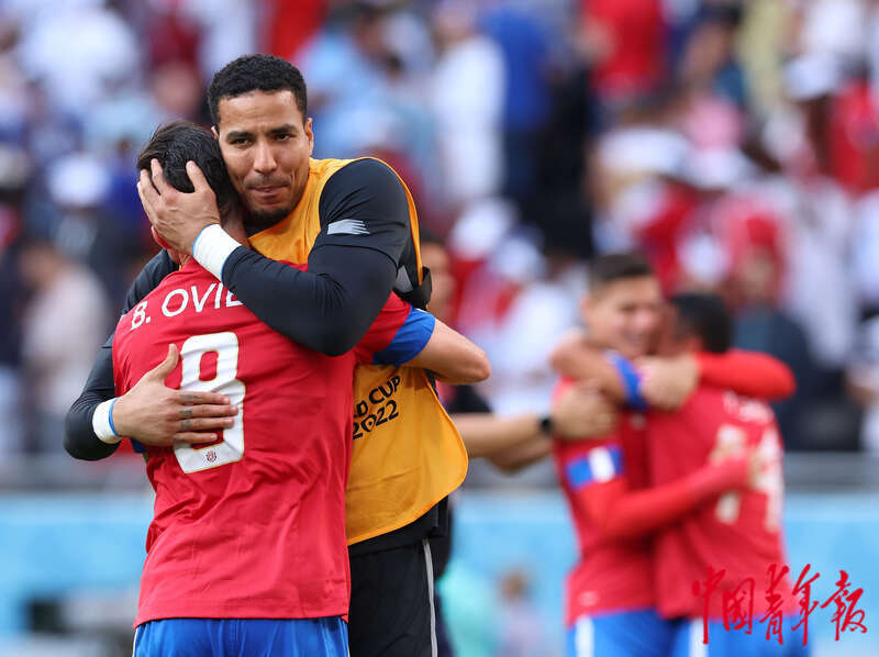11月27日,在卡塔尔赖扬艾哈迈德·本·阿里体育场进行的2022卡塔尔世界杯足球赛E组比赛结束后,哥斯达黎加的队员们拥抱庆祝获胜。刘占崑/摄