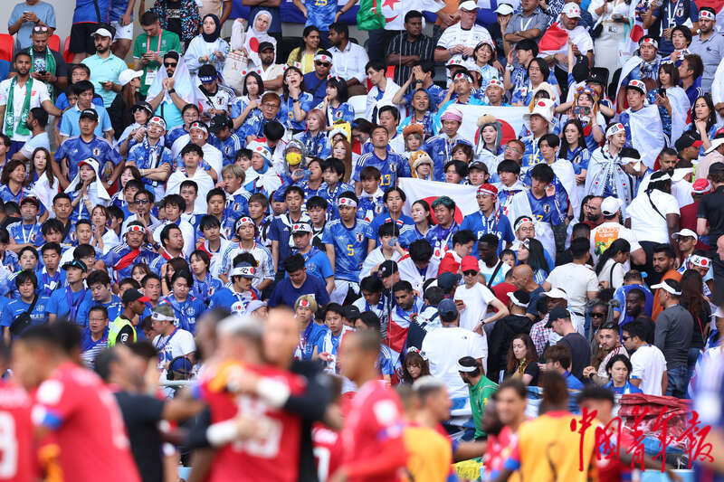 11月27日,在卡塔尔赖扬艾哈迈德·本·阿里体育场进行的2022卡塔尔世界杯足球赛E组比赛结束后,看着哥斯达黎加队员庆祝获胜,看台上的日本球迷有些沮丧。刘占崑/摄