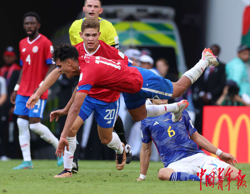 11月27日,在卡塔尔赖扬艾哈迈德·本·阿里体育场进行的2022卡塔尔世界杯足球赛E组比赛中,哥斯达黎加17号球员被日本防守队员放倒。刘占崑/摄