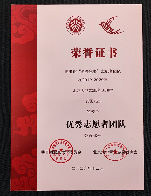 2021年全年,图书馆志愿服务活动已有包括医学部在内的20多个院系、1440余位同学踊跃参与,志愿服务时长总计超过15713小时,合计约折合10个馆员的全年工作量。其中,仅2021年秋季学期,学生志愿者就帮助图书馆完成新书收登与单采图书处理3万余册,完成送书上门服务220余单、馆际互借送书172册。2019-2020学年,图书馆“爱吾家书”志愿者团队获评成为“北京大学青年志愿者优秀团队”。