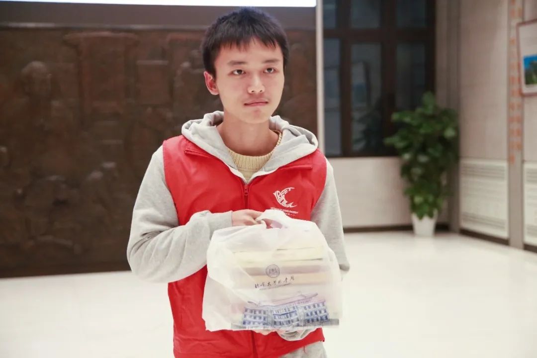 但找书只是第一关,随后,他还要将书送到师生们指定的地点。疫情期间,谢宇航曾接到了两份书单,他在电话中答应马上送到。待他提着两大袋书到了“约定地点”,才发现了自己粗心将校外地址看成了校内地址,而无法出校的他是没法完成这一单的。但谢宇航为了不耽误老师用书,再次和老师联系,反复沟通确认,最终在校门口将书递到老师手中。“当时要同时联系两位老师,还是有些手忙脚乱的”,谢宇航说,但老师收到书的一刻,他的心里还是装满了成就感。
