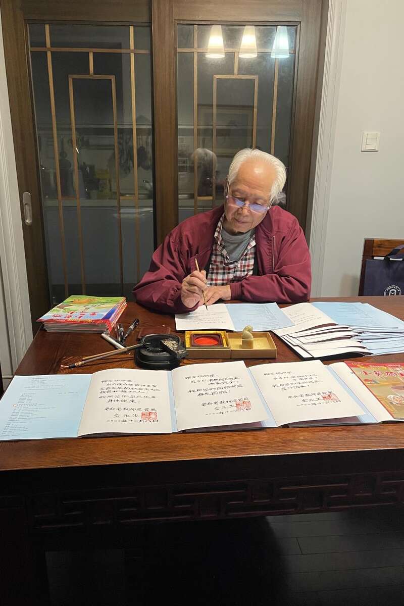 金永发向藏区孩子赠送了一批登山鞋和红色书籍。这名80岁的老教师还用了整整一晚上的时间,在给琼果乡小学师生们的赠书扉页上,给每一名学生都写下了寄语。落款是“老兵老教师老党员金永发”。