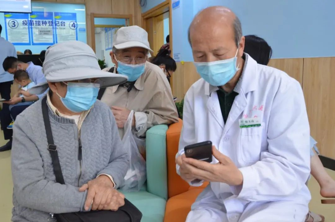 校玉山医生给不会操作预约系统的老年人解释预约流程