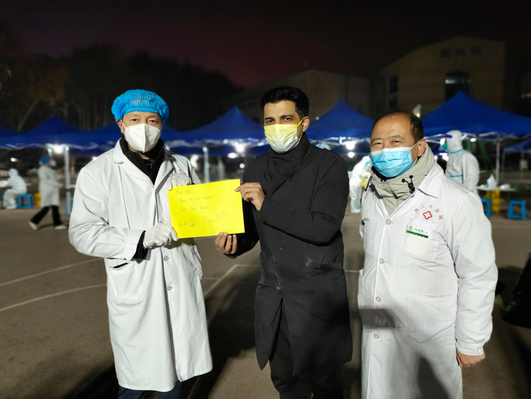 2022年1月,学校核酸采样现场,留学生送来感谢信,左一为校医生