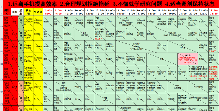 初入大学,紧张的学习节奏、丰富的校园生活令钟翔宇应接不暇。他明白,“纯粹”地做好每一件事,需要合理规划的支撑,于是他尝试着给自己制定计划表。从学期到星期,从每天到每时,专业学习、学生工作、竞赛科研、娱乐活动……他逐渐抓住了学习的节奏感和课余生活的平衡感,将自己的大学生活安排得丰富而充实。