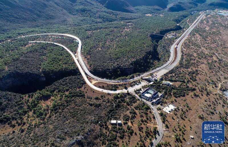 11月27日,观光火车行驶在丽江观光火车一期工程铁路线上(无人机照片)。