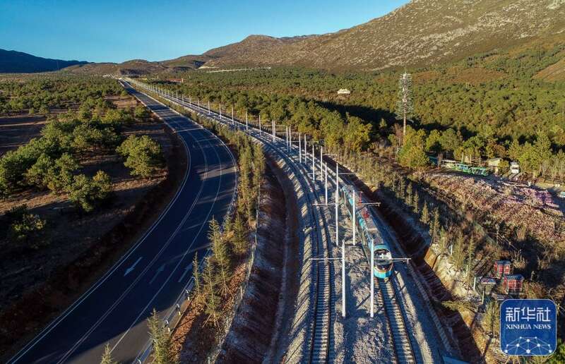 11月28日,观光火车行驶在丽江观光火车一期工程铁路线上(无人机照片)。