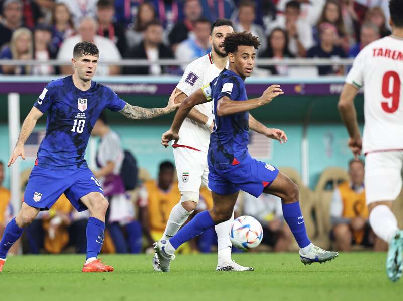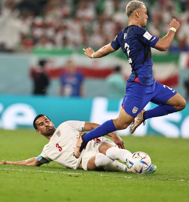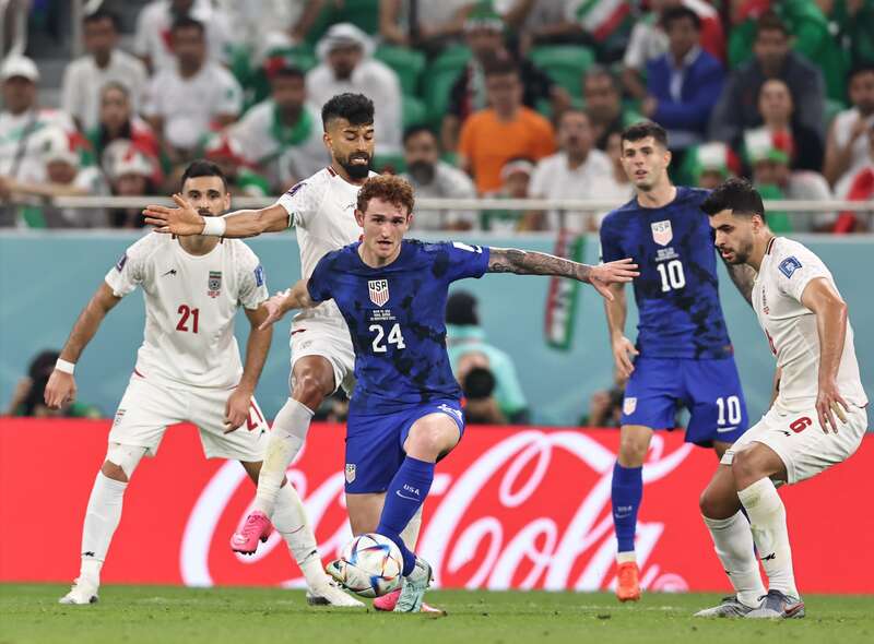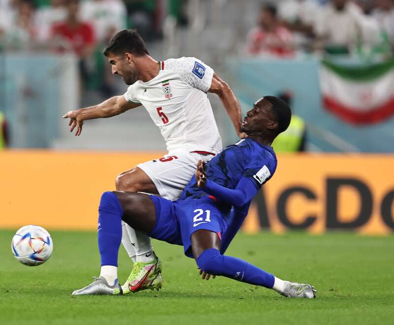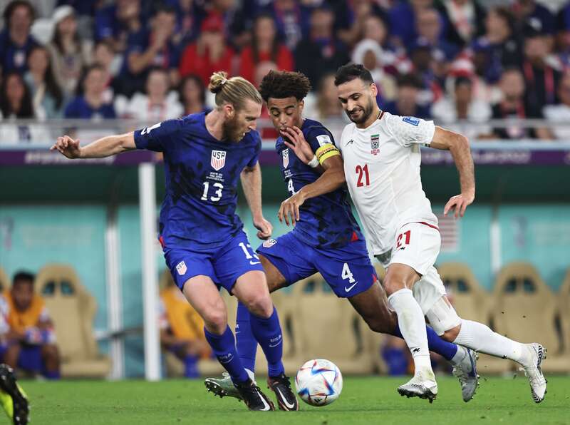 11月29日,在卡塔尔世界杯B组最后一轮小组赛中,美国队和伊朗队球员激烈拼抢。本场比赛中,效力于英超切尔西俱乐部的球星、美国队10号普利西奇打入全场唯一进球,美国队1:0战胜伊朗队,以小组第二名身份晋级16强。伊朗队的本届世界杯之旅则到此结束,未能实现晋级世界杯16强的历史性突破。刘占崑/摄
