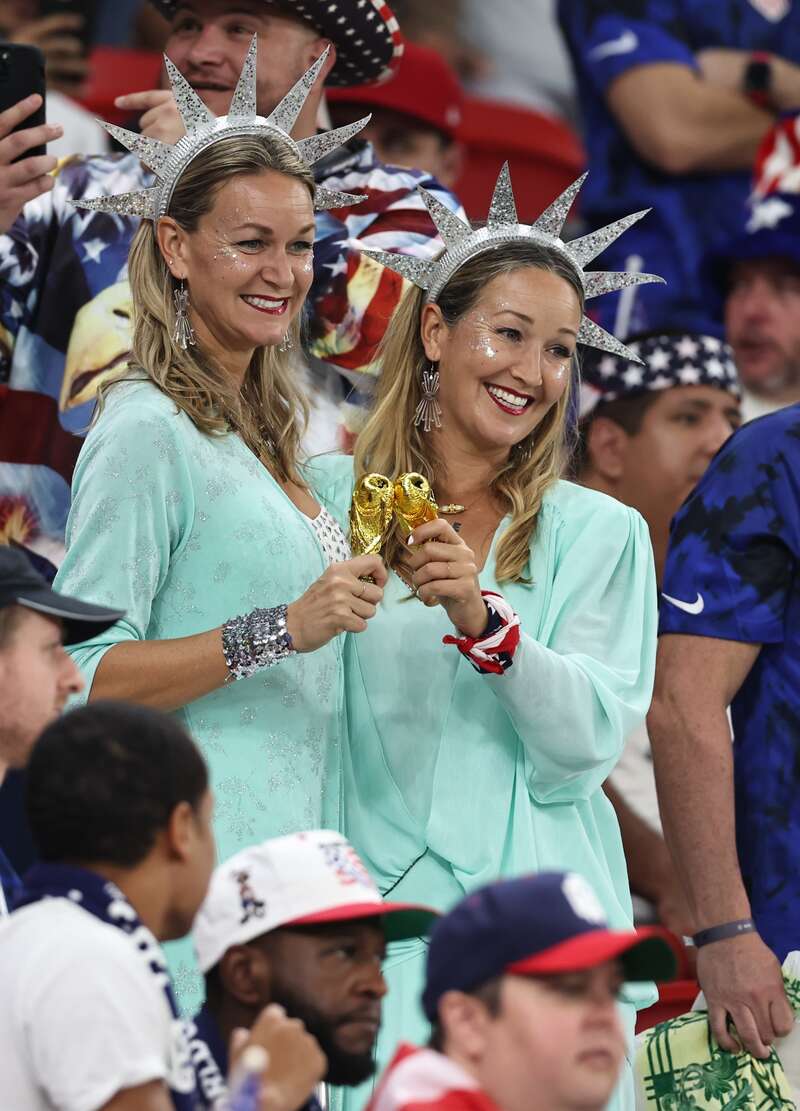 11月29日,在卡塔尔世界杯B组最后一轮小组赛中,一对姐妹球迷为美国队加油助威。刘占崑/摄