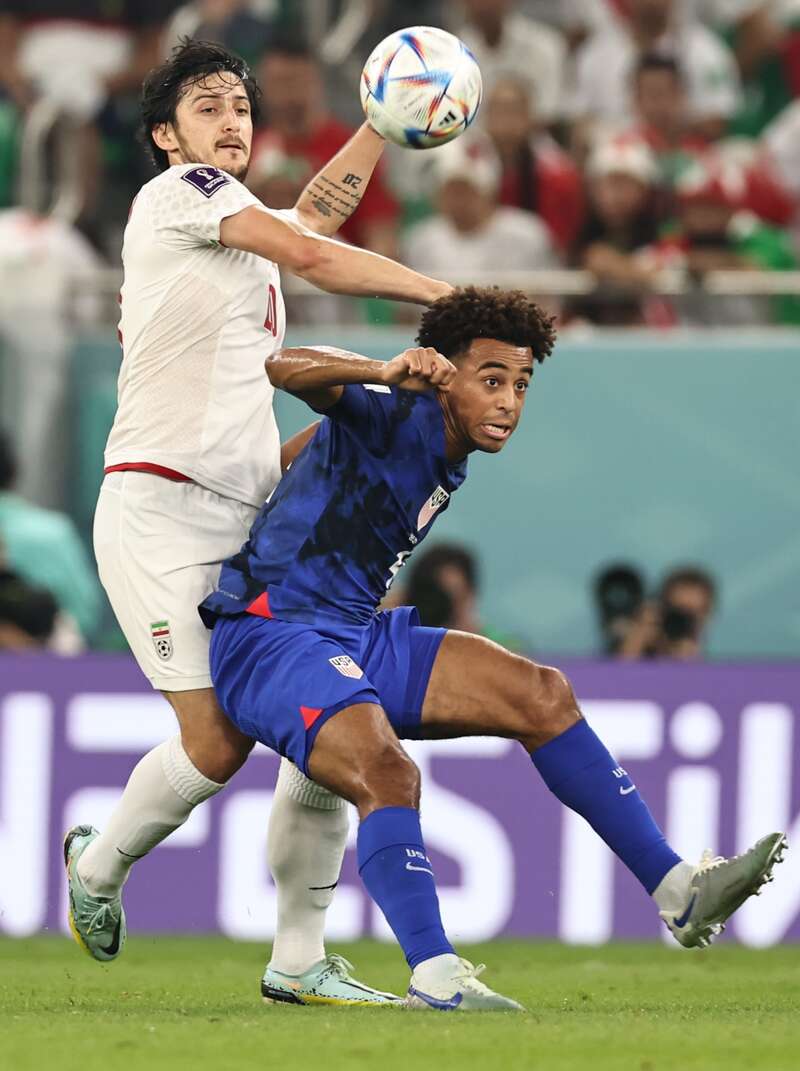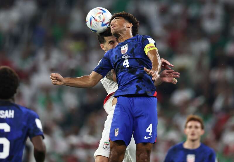 11月29日,在卡塔尔世界杯B组最后一轮小组赛中,美国队和伊朗队球员争夺头球。刘占崑/摄