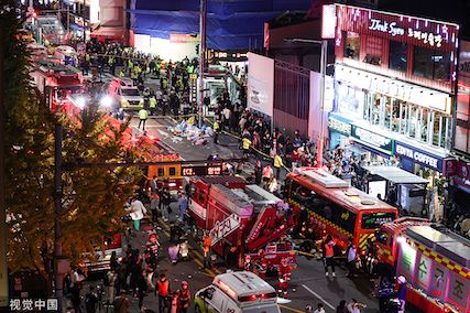 当地时间2022年10月29日,韩国首尔,位于龙山区的梨泰院发生大规模人员伤亡事故。视觉中国 资料图