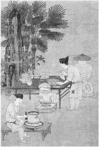 南宋刘松年《撵茶图》局部,再现了宋朝流行的点茶技艺。画中左前方一仆役骑坐在长条矮几上,右手正在转动茶磨磨茶。旁边的黑色方桌上陈列筛茶的茶箩、贮茶的茶盒、茶盏、盏托、茶匙、茶筅等器具,一仆役正伫立桌边,右手提汤瓶,左手执茶盏,欲待点茶。他左手旁边有一风炉,上面正在煮水,右手旁边则是贮水瓮,上覆荷叶。