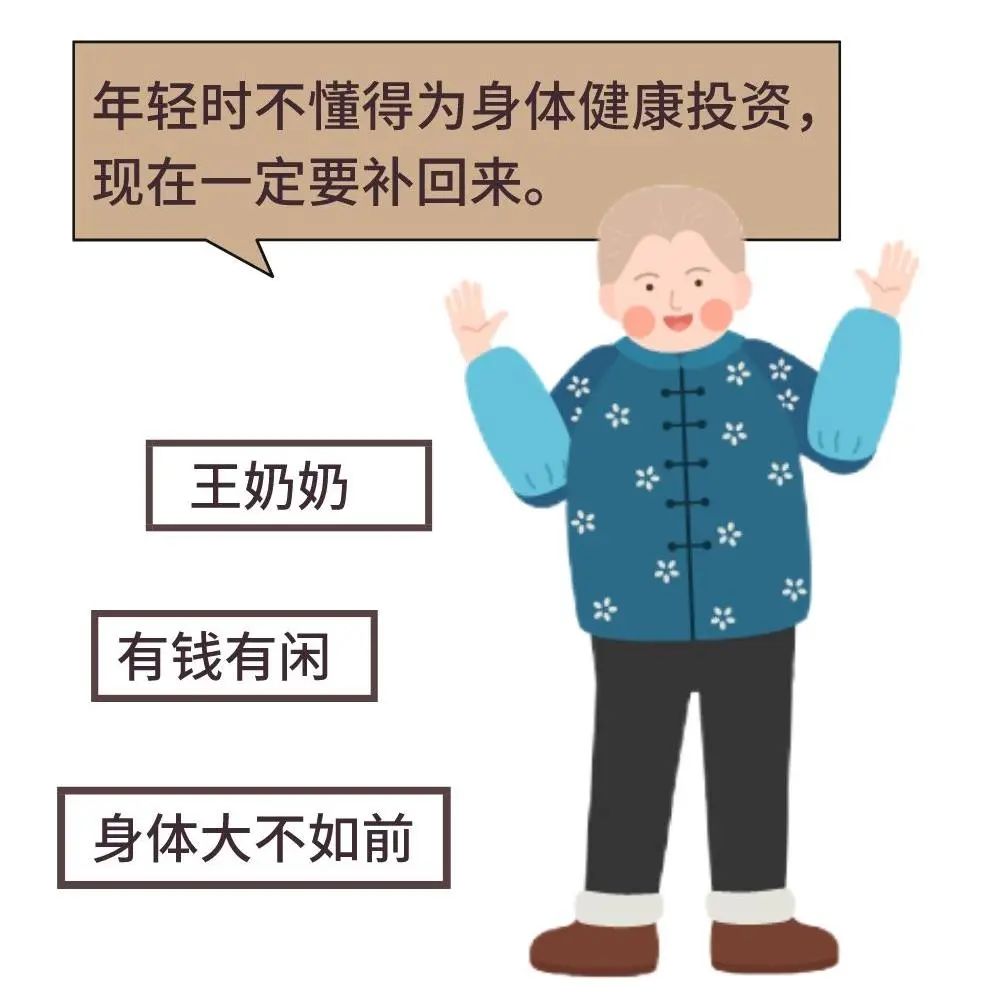 北京的王奶奶出生于上个世纪50年代,年轻的时候,身体健康、时间充裕,但是手里头总是存不下几个钱,从来没有痛快地消费过。现在王奶奶退休了,得益于年轻时的努力奋斗,她领着丰厚的养老金,身体状况却大不如前,虽然有着强大的购买力,但再也没有年轻时候的消费欲望了。王奶奶想了很久,觉得人的一生短暂,现在一定要好好对待自己,年轻时不懂得为身体健康投资,现在一定要补回来。