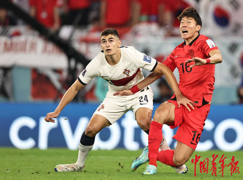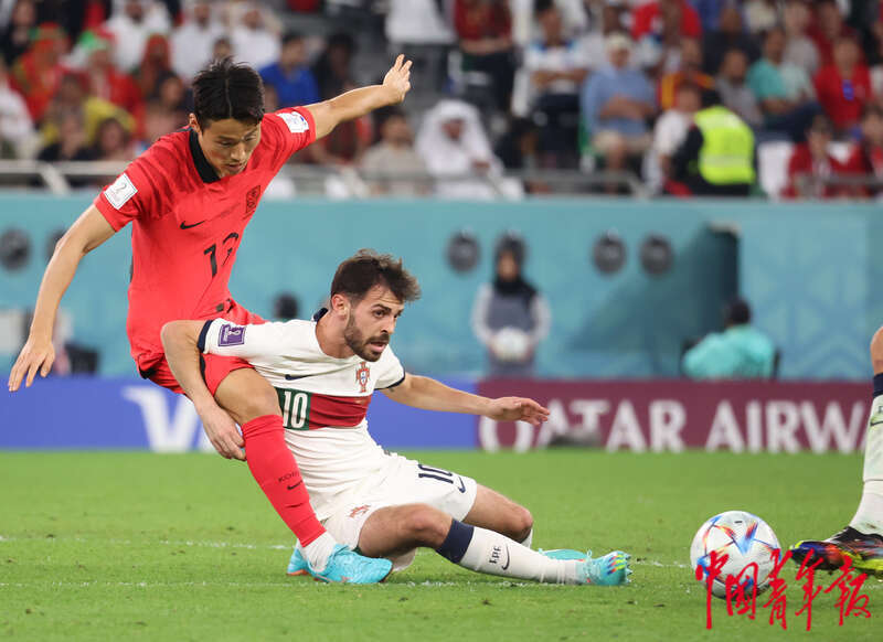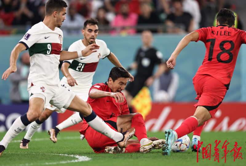 12月2日,在卡塔尔赖扬教育城球场进行的2022卡塔尔世界杯足球赛H组比赛中,葡萄牙队与韩国队球员激烈拼抢。刘占崑/摄