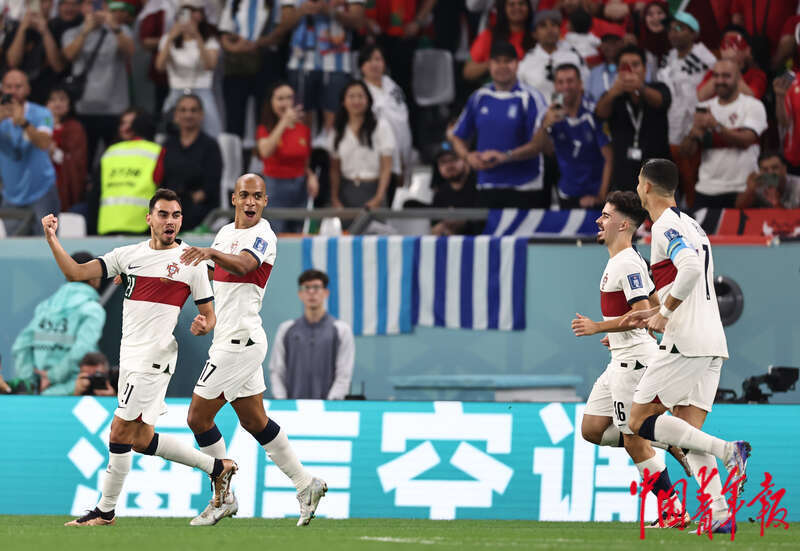 12月2日,在卡塔尔赖扬教育城球场进行的2022卡塔尔世界杯足球赛H组比赛中,葡萄牙队21号球员奥尔塔(左一)攻进一球,和队友庆祝。刘占崑/摄
